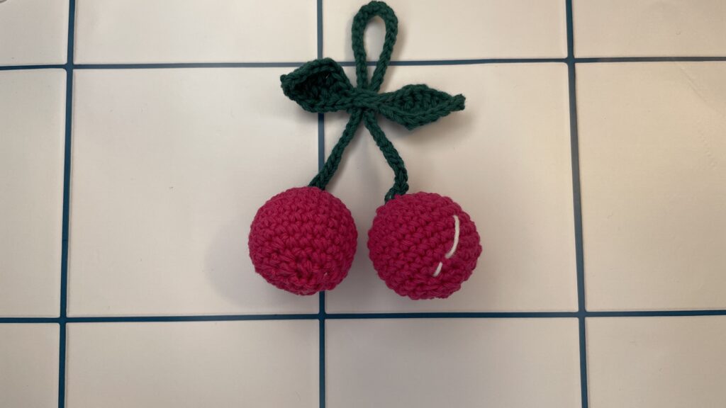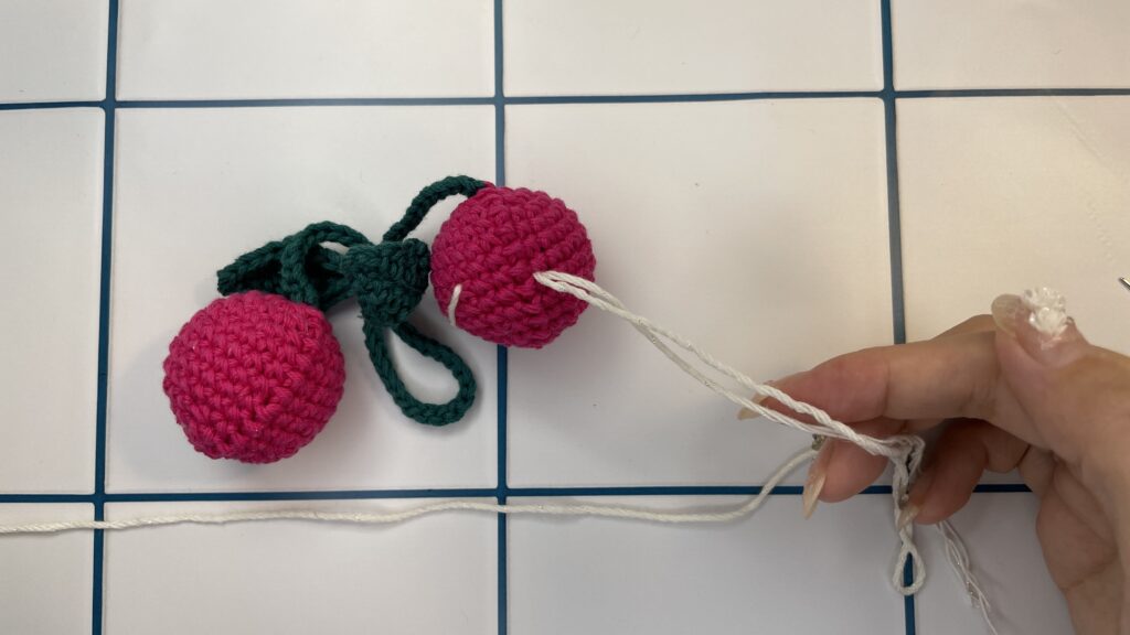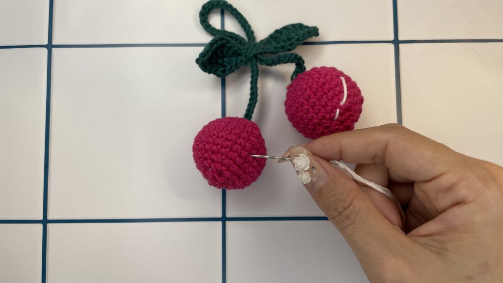 さくらんぼの裏(輪の繋ぎ目)から針を通して光る部分の模様を縫う