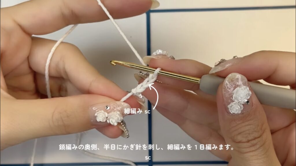 ②かぎ針から2目めの鎖編みの奥側半目に細編み1