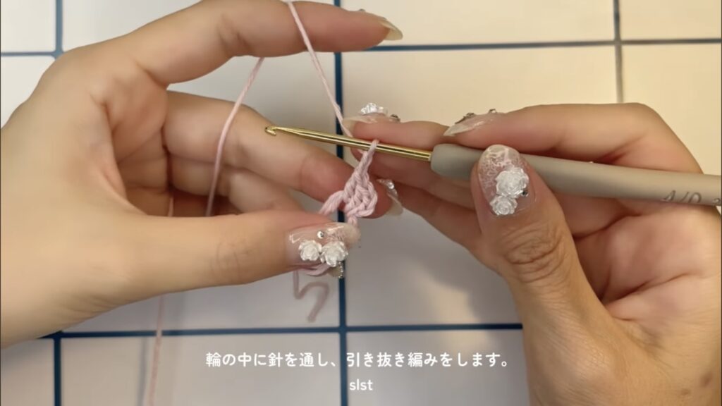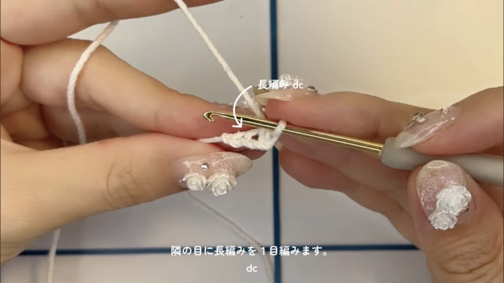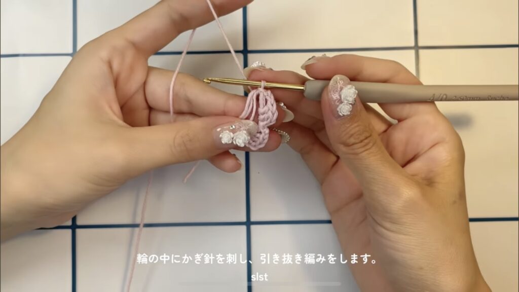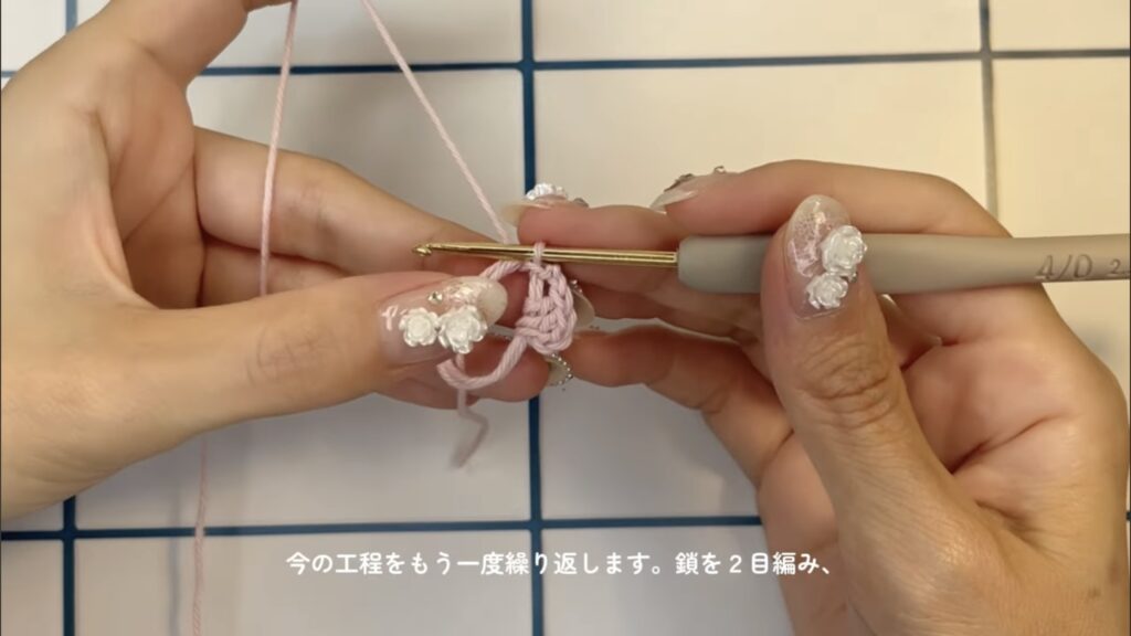 鎖2立ち上がり→輪の中に長編み2回編み入れる→鎖2→輪の中にかぎ針を入れ引き抜き編み
