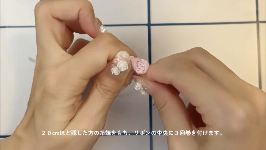 リボンを裏側にむけたら2本の糸端をこま結びする