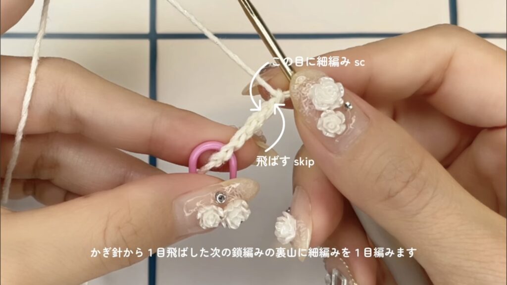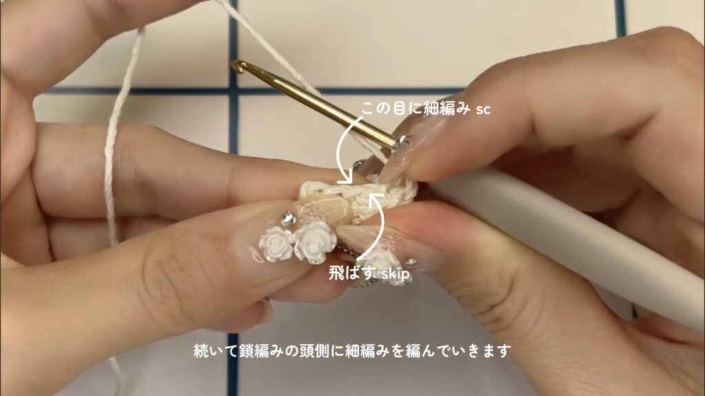 ②立ち上がりの鎖編み1→鎖編みの裏山に細1を3目編む