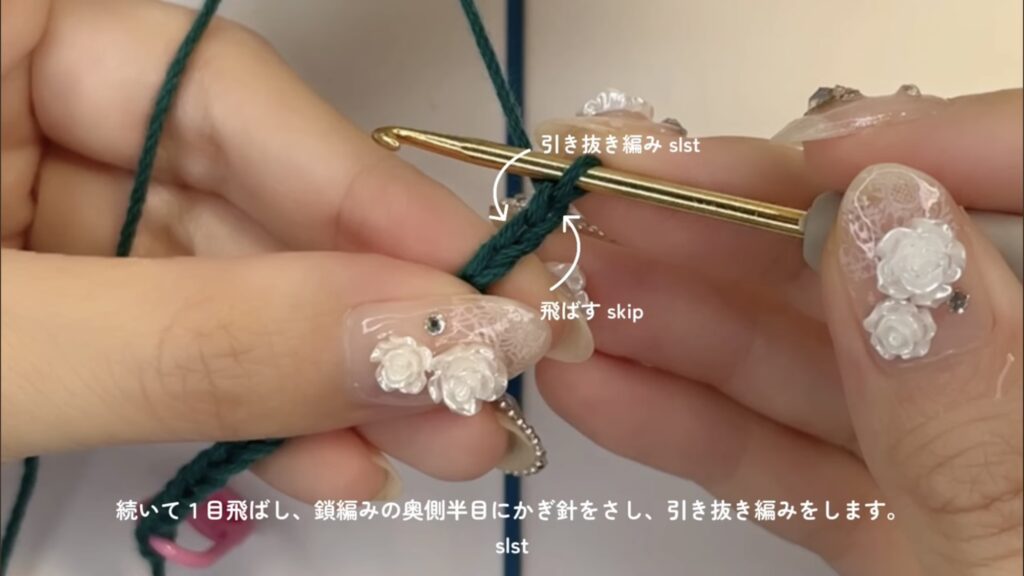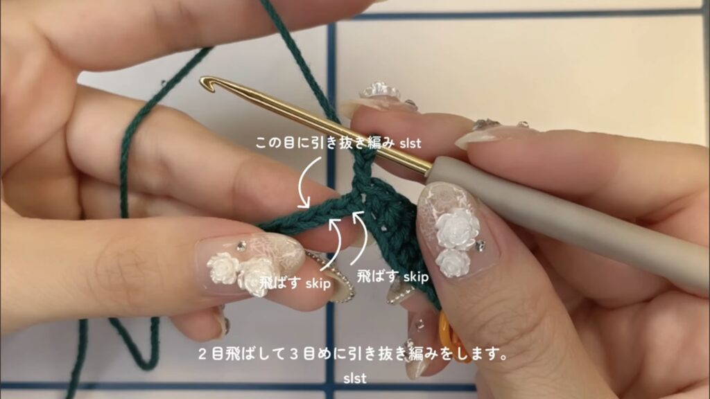 ③鎖編みを2目編み、②で最後引き抜きをした目から2目飛ばした3目めに引き抜き編み