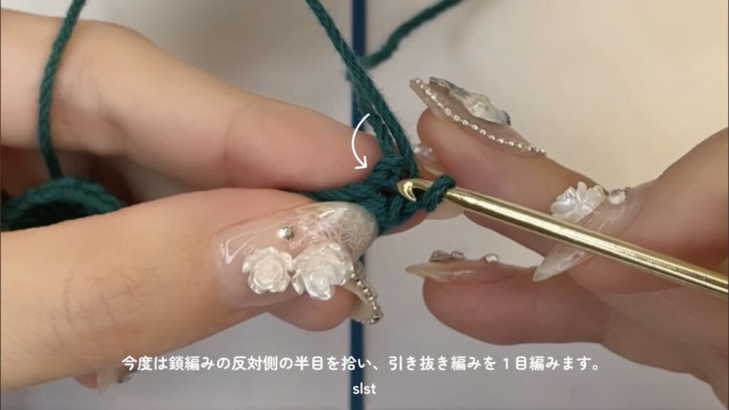 ②立ち上がりの鎖編みを1目編み、かぎ針から1目めを飛ばし、2目めの鎖の奥半目を拾い引き抜き編み(マーカーをつけておく)