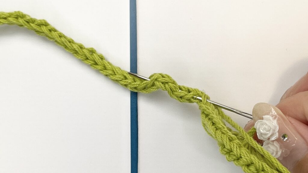 葉の鎖編みを2目編んだ場所がスペースになっているので